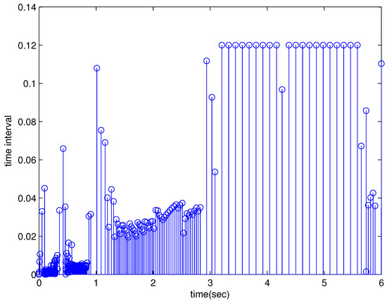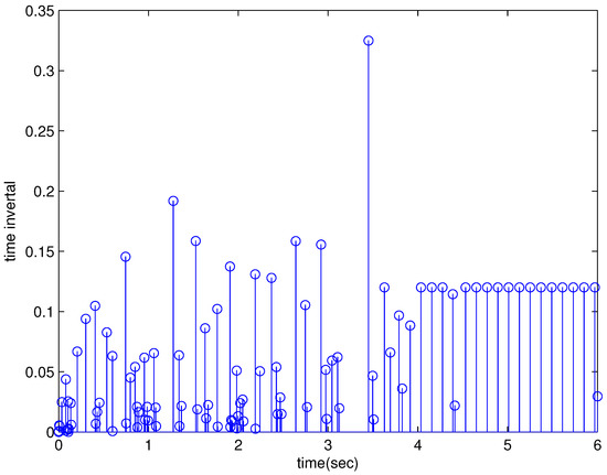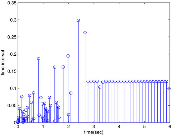 Let us choose , and , the response curves of system states, the control input, switching function and event-triggered executions are given in Figure 2, Figure 3, Figure 4, Figure 5 and Figure 6, respectively. From Figure 2 and Figure 5, one can easily see that the state trajectories of MS are able to be compelled to the desired switching manifold in a limited time, and they then asymptotically slide towards the origin; thus, the robust stabilization of the memristive system is well established. Furthermore, it is not hard to see from Figure 6 that the triggering intervals are larger than zero, and as a result, the Zeno behavior does not arise in the whole dynamical evolution of MS.