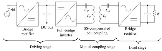 The general scheme of an IPT system comprises three stages: a primary section, supplied by a grid, followed by a compensated inductive coupling with a primary and a secondary coil and finally by a secondary section that charges a battery. The primary coil is driven by an alternating signal supplied by a full-bridge inverter located in the primary section. The voltage induced across the secondary coil is, in turn, rectified and conditioned prior to feeding the battery, sometimes with the insertion of a DC/DC converter or simply with a filter capacitor. The battery is usually replaced in laboratory prototypes with a variable resistor R that reflects its state of charge (SOC) at a given time of the charging process [1]. Figure 1 depicts the three stages particularized for the SS-compensated IPT prototype used in this work.