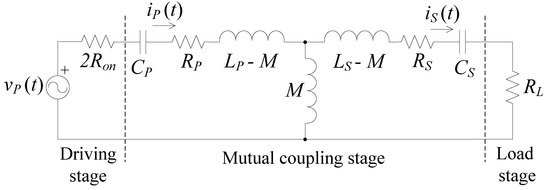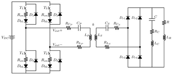 The conduction resistance of any of the four inverter switches is modeled with . Since two switches are closed at any given time when an AC output is synthesized from a DC input, the circuit model includes the resistance in series with the driving voltage. The resistance results from the sum of two contributions located in the primary section and connected in series: the stray series resistance of the primary coil, , and the stray series resistance of the primary capacitance, . The resistance is, in turn, the sum of the stray series resistances of the secondary coil, , and that of the secondary capacitance, . accounts for the equivalent resistance of the rectifier stage and the battery. M represents the mutual inductance between the two coils, which relates to k and to the primary and secondary self-inductances and through the following expression: