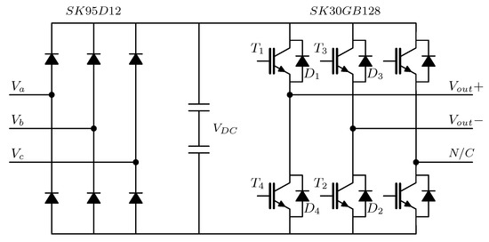 The driving stage, which was fed from a single-phase 230 V/50 Hz outlet of the power grid, features an AC/DC converter that provides a stable DC bus voltage , followed by an H-bridge inverter based on IGBT switches. The driving function was implemented using two legs of a modular three-phase inverter connected to the grid, purchased from Semikron Electronics S.L., Barcelona, Spain. It includes a bridge rectifier (ref. SK95D12), an IGBT module (ref. SK30GB128) and some additional electronics. Figure 4 depicts a simplified circuit diagram of the driving stage.