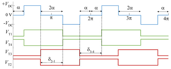 Although the H-bridge inverter is a single-phase two-level voltage-source converter (VSC), its switching scheme is such that it does not produce a square wave output voltage, but rather a controlled one with intervals in which the output is both zero and and . This controlled output with three output levels, whose duty cycle can be adjusted, is characteristic of a phase-shift control scheme. The inverter output voltage can be set to zero periodically during the so-called interval of zero voltage, whose duration can be regulated in the full range from 0 rad to rad throughout each period. It is characterized by the zero-voltage angle , which varies from 0 rad to rad. As can be seen in Figure 5, the trigger pulses and , which are applied to their respective IGBT gates located on the left leg of the inverter, are complementary. The same applies to the trigger pulses on the right leg, and . The four pulses have a duty cycle of 50%. The synchronization scheme results in a phase shift between the pulses and , on the one hand, and a second phase shift between and , on the other. Both of them are equal to , whereas the interval of zero voltage is throughout a period.