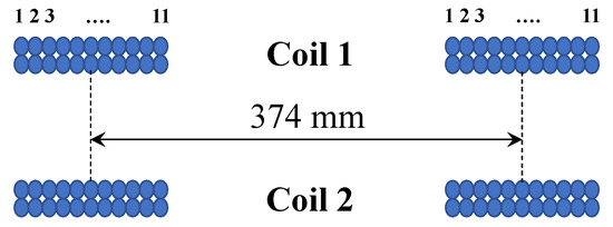 Both circular and square coils have been reported in the construction of IPT prototypes. Considering that the mutual inductance M between square coils is times larger than between circular ones when the corresponding circumference is inscribed in the square [30], square rather than circular coils were chosen to design the coupling stage. The two coils, which were wound using Litz wire with a section of 6.28 , have 22 turns each with 11 turns piled up on top of the other 11, as Figure 6 illustrates.