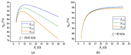 The load power depends strongly on both and R. For , the air gap for which the magnetic coupling is the strongest of all three, reached 2 kW when R was 5 (higher loads led to lower transferred powers). On the other hand, if the three air gaps are considered altogether, was always above 1 kW for R = 5 and below 500 W for R = 30 . The overall efficiency, computed from grid supply to load, was 82.5% for the intermediate case of . However, if only the coil coupling stage is taken into account, it exceeded 90%. Further details regarding the prototype performance can be found in [14]. It should be noted that, according to (9) , the efficiency of an SS-compensated inductive coupling stage depends, among other parameters, on the resonance frequency and the mutual inductance M, and an increase in either of them causes an increase in the efficiency. Figure 7 plots calculated with (9) for the three air gaps and two different resonance frequencies (18.65 kHz and 85 kHz), with the load resistance ranging from 2.5 to 40 . As can be seen, when the frequency is 18.65 kHz, is above 90% only under certain operation conditions, in agreement with the efficiency figures found experimentally. However, for the case of 85 kHz, represents a significant improvement, exceeding 95% for most of the loads and air gaps. Unfortunately, the desired increase in that arises as a consequence of an increase in either M or is accompanied necessarily by a reduction in the power delivered to the load, as follows from (8). Consequently, an IPT system working at a relatively low frequency of operation, as in the case discussed in this work, is characterized by moderate efficiency figures that are compensated by an enhanced power transfer capability.