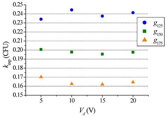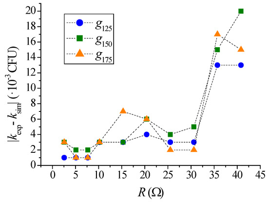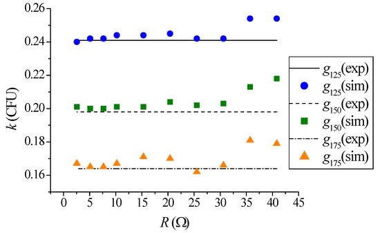 Assuming that was obtained with an error of , and plotting k against R for for illustration purposes, it is apparent that k undergoes an increasingly larger shift from the k factors obtained with as R increases. As can be seen in Figure 13, the error has little or no influence on k within the low load range. However, from 10 onward, the shifts grow larger and larger both above and below the initial k values, reaching a maximum of CFU for 40 (k = 0.250 for + 0.25 and k = 0.258 for − 0.25). If a small measurement error in the determination of is taken into account, the capability of the system to deliver reliable figures for k consequently worsens as R increases. This may contribute to justifying the deviations found in the determination of k for the two largest loads.