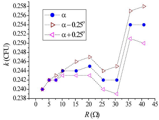 The deviations from the experimental k factors, expressed in coupling factor units (CFU), are plotted in Figure 12 in the form of absolute errors. They reach a maximum of CFU with the exception of the two cases mentioned previously, in which they grow remarkably larger. Overall, the area of low R (up to 10 ) behaves best, as the deviations are CFU or less for the three . It should be noted that the absolute errors found for are the smallest for the ten loads, ranging from to CFU with the exception, once again, of the two largest load resistances.