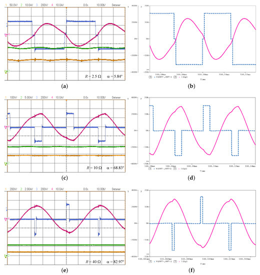 Both experimental and simulated waveforms are shown in Figure 14 for comparison purposes. The inverter output voltages and currents are represented by blue and pink lines, respectively. A selection of three representative cases was chosen (specifically, those corresponding to 2.5, 10 and 40 for the intermediate air gap ). Note that the duty cycle of the inverter output voltage is very low for 40 , one of the two cases in which the circuit model behaves worst.