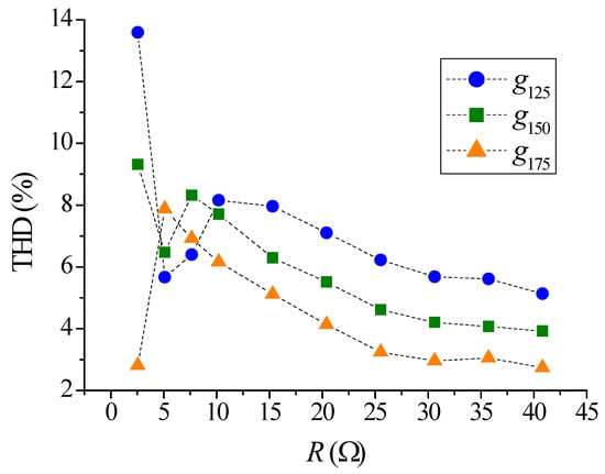 A comparison of the shapes and amplitudes of the two sets of waveforms makes it possible to conclude that the simulated waveforms are very similar to their experimental counterparts. Moreover, the shape of the current waveforms is quite sinusoidal in all cases, which confirms the validity of the FHA approximation adopted before analyzing the equivalent circuit of the IPT prototype. The low harmonic content of the primary current waveforms can be understood in terms of the band-pass filtering process introduced by the resonant circuit on the primary side of the coupling. Alternatively, it can be regarded as a consequence of dealing with loosely coupled coils, which are characterized by a low k. Recall that leakage inductances are, according to (2) and (3), relatively large in the circuit model of a weak inductive coupling: a large leakage inductance effectively filters out most of the harmonic content of the current waveform, leading to the observed sinusoidal-like waveforms. Furthermore, the larger the air gap is, the larger the leakage inductance becomes, and more frequencies are consequently rejected from the spectrum of the current waveform. This effect is illustrated in Figure 15, which represents the total harmonic distortion (THD) versus R. As can be seen, the harmonic content decreases as increases, which is easier to verify for those loads in which is similar for the three (all of them, with the exception of the three smaller ones). In the case of small loads (up to 10 ), the plot does not show the effect clearly since, for a given load, the corresponding three angles are quite different depending on . Finally, it should be pointed out that no correlation was found between the harmonic content and the deviations in k depicted in Figure 12. In fact, the THD is especially low for the two largest loads, for which the model behaves worst. It is not, therefore, possible to claim that the two estimates of k with the largest absolute errors occur as a consequence of a high harmonic content in the corresponding current waveforms.
