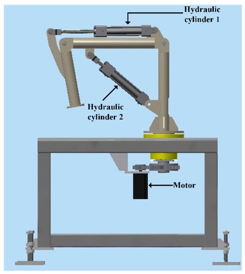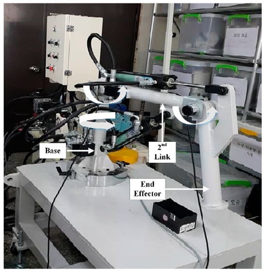 The slave device for the experiment is shown in Figure 7. The hydraulic servo system consists of two hydraulic cylinders and one AC servo motor. The first base axis is actuated by the AC servo motor. The 2nd link and end effector are actuated by the hydraulic cylinder.