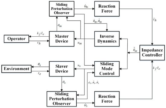 where , and are the inertia, damping, and stiffness of the impedance control model respectively, represents the scale factor of the reaction force. The scale factor scales the force ratio that is converted from the master system to the slave system. For simplicity, in this study is considered to be unity. The control input signal to the master system can be determined by replacing the estimated/observed state variable to the original ones. Thus, the control input for a dynamical system of Equation (38) and impedance control of Equation (40) can be mathematically presented as follows,