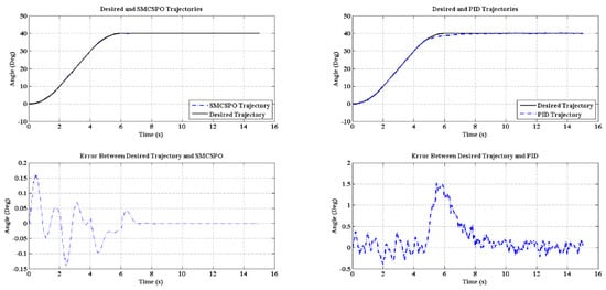 In our study, our system is non-linear, and therefore, a robust control scheme (i.e., SMCSPO) was pursued. Since PID/PD controllers are not robust, comparatively to SMCSPO, to nonlinearities. Therefore, their performance is not as good as that of the proposed SMCSPO. Figure 10 shows the comparison between PID and SMCSPO.