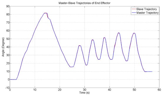 Figure 21 shows the experimental result of master–slave trajectories for the base axis. The blue line shows the experimental result of the master device whereas, the red line shows the experimental result of the slave device by using SMCSPO. It can be seen that the slave device can follow the master device. The maximum value of the trajectory is 100 degrees at 13 s. The base of the slave device can move between 0 and 360 degrees.
