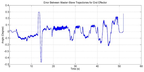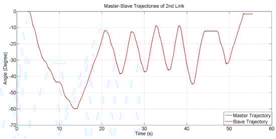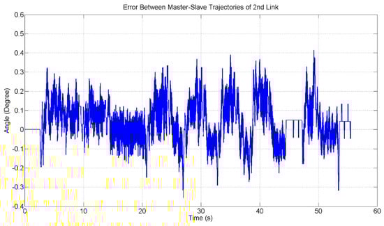 The error between master–slave trajectories for the 2nd Link is shown in Figure 17. The maximum error between master and slave trajectories are 0.41 degree at 49 s.