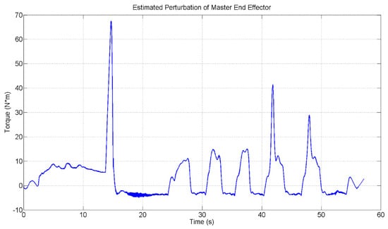 where , , are the control input, estimated speed and estimated position of the master system by utilizing SPO, represents the torque estimate that is produced by the operator while operating the master device. The master device used in this research is presented in Figure 6.
