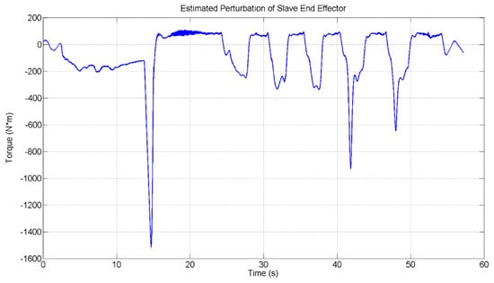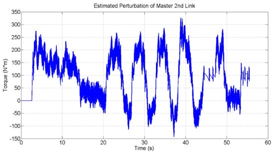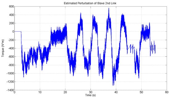 Figure 18 and Figure 19 show the estimated perturbation of master and slave for the 2nd link. The maximum estimated perturbation of the master is 326.6367 N*m at 38.5 s. While the maximum estimated perturbation of the slave is 1296.9 N*m at 38.5 s. The pattern of master and slave estimated perturbation is the same but in opposite direction.