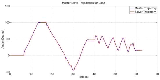 The error between master–slave trajectories for the base is shown in Figure 22. The maximum error between master and slave trajectories is 1.3 degrees at 26.5 s.