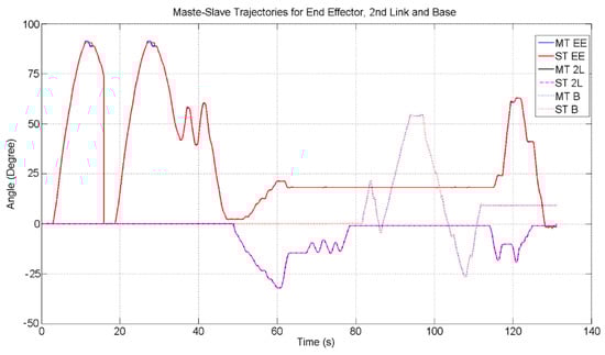 Master–slave trajectories for end effector, 2nd link and base.