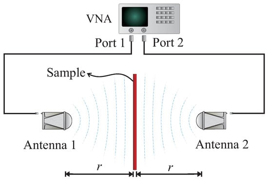 The FSM consists in connecting antennas to the ports of a VNA and using them to sense the propagation path of interest; in this way, different materials can be characterized by means of proper reconstruction algorithms [1,3,4,5,6]. The FSM is contactless, requires little sample preparation and is suitable for heterogeneous samples. It can be used for measuring large flat solids, materials under high temperature [7], liquids [8], gases [1,6], radomes in aerospace [9], multi-layered dielectrics [10], composite materials and metamaterials [11,12,13,14]. One should note that the effective response, the non-invasive nature and the wideband operation are essential in many actual applications.