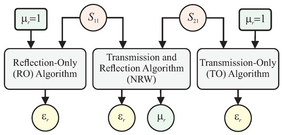 Here, the complex scattering parameters and are input data to three extraction algorithms, as illustrated in Figure 2 and explained afterwards: (a) the Nicolson-Ross-Weir (NRW) Algorithm, (b) The Reflection-Only (RO) Algorithm, and (c) The Transmission-Only (TO) Algorithm. These are frequency-by-frequency methods, since the properties are extracted for each particular frequency [1], in a point-to-point sweep. In the following the relative permittivity and permeability are assumed to be complex, that is, and , respectively.