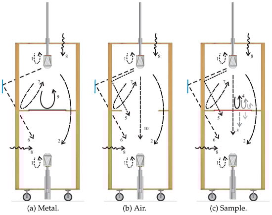 Each calibrated scattering parameter is obtained by three measurements: (a) measuring a metal plate with the same cross section of the sample; (b) leaving the setup empty; and, finally, (c) measuring the material under test (sample) [27,38]. Figure 4 illustrates possible contributions to the measured signals: reflections at the antennas due to mismatches (arrow 1); diffracted signal (arrow 2); signal transmitted through the sample and its secondary components (arrow 3); multiple reflections on the sample (arrow 4); signal reflected somewhere and passed through the sample area (arrow 5); signal reflected somewhere but did not cross the sample area (arrow 6); signal reflected somewhere and returned to antenna 1 (arrow 7); external influences that are not systematic and must be treated as noise (arrow 8); signal reflected on the metallic plane (arrow 9); and the transmitted signal at the empty setup (arrow 10).