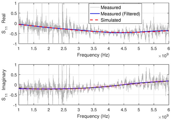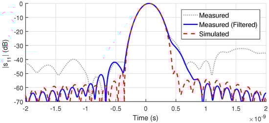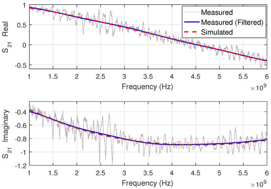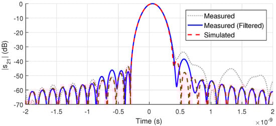 Note by Figure 6 and Figure 7 that the filtered data match very well the frequency behavior of the simulated scattering parameters. However, a spurious low-level oscillation is still present due to: (a) the inherent difficulty in sharply separating the noise from the genuine signal when they are too close in TD. In particular, this gets worse when the TD resolution is not so high to avoid overlapping, that is, unresolved peaks; and (b) the gated signal presents errors concentrated on the frequency band edges and also a small oscillation over the whole band [50]. Therefore, a residual distortion is a typical characteristic of gated signals and, in our context, it leads to some distortion on the extracted properties.