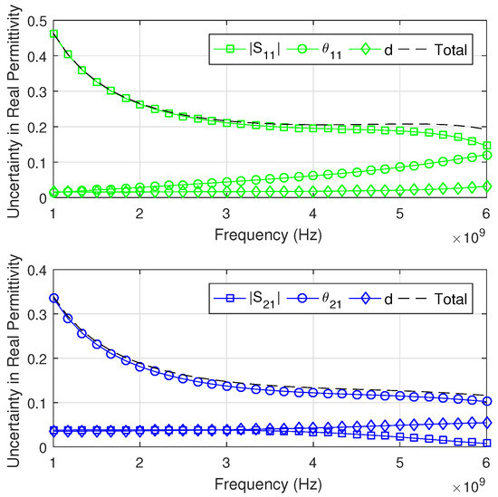 The uncertainty in the real part of permittivity () due to the uncertainties in the magnitude and phase of the S-Parameters and in the thickness d. The reflection configuration is on the top, whilst the transmission is on the bottom.