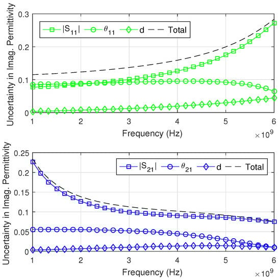 The uncertainty in the imaginary part of permittivity () due to the uncertainties in the magnitude and phase of the S-Parameters and in the thickness d. The reflection configuration is on the top; the transmission is on the bottom.