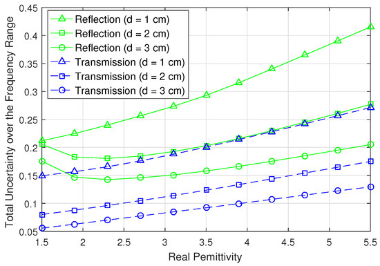 The resulting uncertainty is shown in Figure 12, for reflection data and also for transmission data, that is and , respectively. Three values of thickness d are used. Note that: (a) smaller uncertainties are achieved with thicker samples and using transmission; (b) the uncertainty tends to increase as increases; (c) the curves are quite linear in transmission mode; (d) the most variation is for lower in the reflection mode.