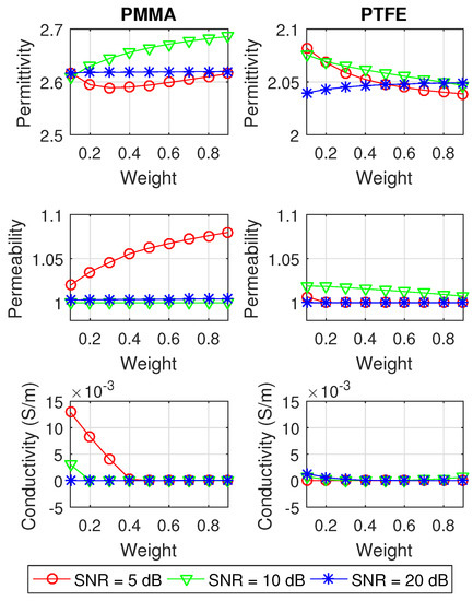 Here we simulate the same scenarios of Section 4.1, but with different weights w in (3). Observe that when using 0 or 1, either transmission or reflection is used, respectively. The dependence of the scattering parameters on the searched for , and varies with frequency, providing more or less sensitivity for either or . In order to avoid ill conditioning we limit . Thus, we always use both transmission and reflection, but with different weights.