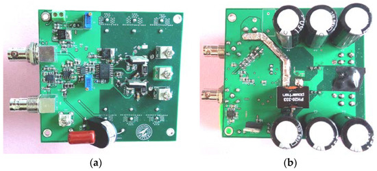 Figure 6a,b respectively. GaN cascode is realized by combining a low-voltage Si MOSFET with a high-voltage GaN HEMT to exhibit low-conduction and switching power losses. The TPH3006PD (Transphorm Inc., San Jose, CA, USA) available in TO-220 package is used to realize the power circuit. A conventional totem-pole gate driver with a low-valued gate resistance of 3 Ω is used to enable fast switching. The parasitic inductances of the package are high, which is responsible for drain voltage overshoot followed during turn-off transient. Therefore, an resistor-capacitor (RC) snubber across the low-side GaN cascode is used to suppress undesired oscillations. Three 150 µF electrolytic capacitors are connected in parallel to achieve high bus capacitance and reduce the effect of interconnection inductances.