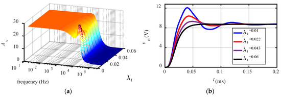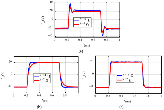 Figure 9a indicates that the response of the open-loop GaN class-D amplifier is strongly dependent on the load, and the observed voltage overshoot and settling time are 9.34 V and 0.15 ms, respectively, for