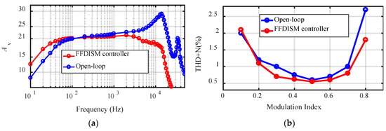 Figure 8a shows the frequency response of the closed-loop class-D amplifier using frequency sweep ranging from 10 Hz to 300 kHz. The frequency response of the FFDISM-controlled amplifier is presented to investigate the significance of the inner-loop for different values of the capacitor current gain