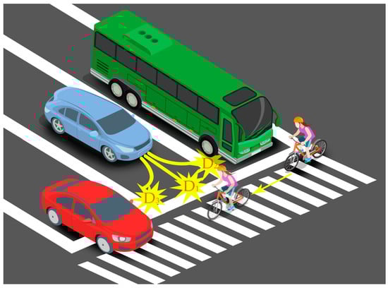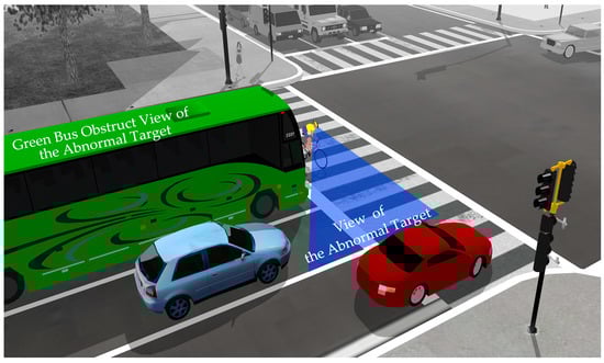 In this paper, the emergency situations of red light-running behaviors particularly refer to where abnormal targets (pedestrians, non-motor vehicles, pets, etc., collectively regarded as “abnormal target”) continue to pass through a crosswalk, even though the RL is on in the crosswalk of the intersection. In this process, the avoidance space caused by the sudden entry of an abnormal target is insufficient. Therefore, a collision cannot be avoided under the emergency situations. A typical case is shown in Figure 1. We regard the blue vehicle as the AV. At this scene, the RLs are on for the crosswalk and left-turn lane. The left view of the AV is obstructed by the left turn-waiting green bus, thus the abnormal target fails to be detected in advance by the blue vehicle. It is about to encounter the emergency situation.