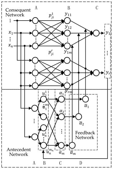 where (i = 1, 2, …, r) is the weighted sum of each rule. The output of the antecedent network is used as the connection weight of the layer G.