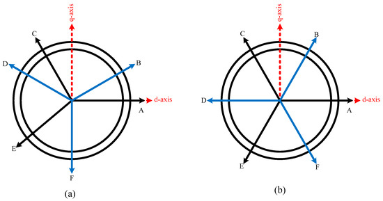 Two different topologies of DTP-PMSMs, i.e., symmetric and asymmetric, have frequently been discussed in the literature. A DTP-PMSM utilizes a pair of three-phase windings shifted by 30 degrees and 60 degrees is termed as asymmetric and symmetric winding configurations respectively [10]; both formations are illustrated in Figure 1. The difference between symmetric and asymmetric winding configurations is explained in [11]. Since asymmetric winding arrangements for DTP-PMSMs possess low iron losses and low torque ripple, they have widely been used by researchers. Therefore, for this study, asymmetric winding configuration is considered. Furthermore, there are two circuit topologies which can be used for inverter-fed DTP-PMSMs: one with a single natural (where all six-phases of the machine connected to a single natural point), and another with two isolated natural (where two sets of windings i.e., ACE and BDF are connected separately with two naturals, ACE and BDF represents the six-phases of machine), as depicted in Figure 2.