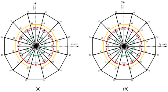To understand the vector control for DTP-PMSMs, it is obligatory to explain the space vector pulse width modulation (SVPWM). In this section of the paper, a modulation scheme for a DTP-SVPWM is comprehensively explained. In a conventional, two-level dual three-phase inverter as shown in Figure 2a, the machine is fed with 26 = 64 inverter voltage vectors; out of those, 60 vectors are active, and 4 vectors, i.e., 0, 21, 42 and 63, are inactive, and are mapped at the origin. These voltage vectors are projected onto the αβ- and Z1Z2-planex; the mapping of voltage vectors on the αβ-plane is described in Figure 3.