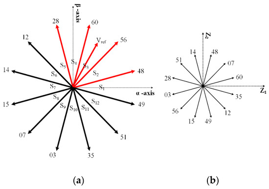 Projection of voltage vectors: (a) On αβ-plane; (b) On Z1Z2-plane.