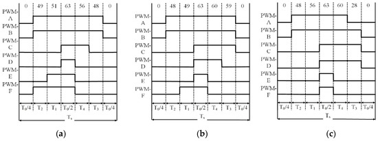 PWM waveforms for all phases: (a) Sector I; (b) Sector II and (c) Sector III.