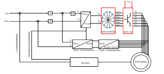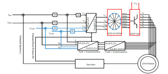 The different sections of this paper are organized as follows: Section 2 deals with the theory of space vector decomposition and analytical model of DTP-PMSMs. In Section 3, the theory and implementation of two and four current-loops for vector control are discussed with a brief theoretical background of DTP-SVPWM (space vector pulse width modulation). Comparative analysis of performance for both approaches with the help of simulation-based results are the subject of Section 4; Section 5 concludes this paper.