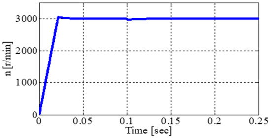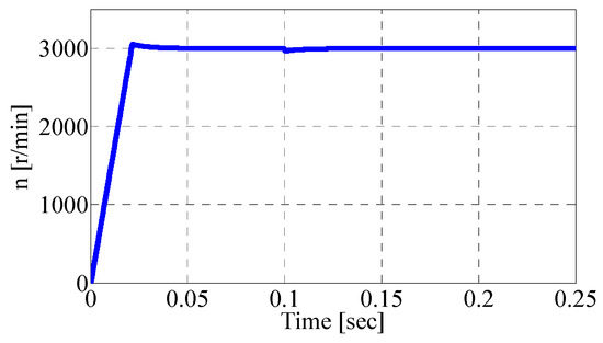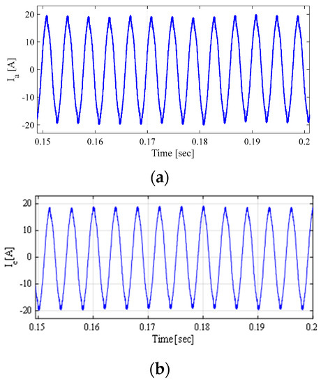 The schematic diagram for typical vector control with two axes current control is shown in Figure 6. The simulation model was developed based on the block diagram shown in Figure 6, and with consideration of the machine parameters, as discussed in the paper [14], and reproduced in Appendix A, to investigate the performance of the machine under different working conditions. In the first simulation-based experiment, two currents were used in feedback loops under the following conditions: a machine was tested at a rated speed and full load. In this sense, different results were obtained to understand and evaluate the dynamic performance of the machine. In Figure 7, the load currents are shown. In this result, transients at 0.1 s can be observed; the details are as follows. Before reaching to this point, the machine was running at no load. At 0.1 s, a rated load of 16 Nm was applied to the machine, and it started consuming its rated current. In Figure 8 phase currents of winding set ACE are represented. Some supporting results include electromechanical torque and speed, which are portrayed in Figure 9 and Figure 10 respectively. It must be observed that these results were obtained at a rated speed of i.e., 3000 r/min. Moreover, these phase currents elucidated in the Figure 10 were obtained after the application of load and zooming between 0.15 s to 0.2 s.