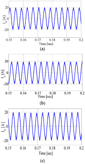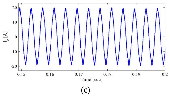 Phase currents of winding set ACE; (a) Phase current “A” measured in amperes; (b) Phase current “C” measured in amperes and (c) Phase current E measured in amperes.