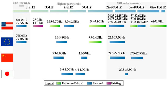 5G is the next leap in the evolution of wireless communication which introduces many improvements to the existing telecommunications industry, but also comes with various challenges. This emerging technology provides low latency, ultra-high-speed massive connectivity between devices leading to cross-industry transformations, pervasive processing in an ecosystem, where all devices are interconnected [4]. Organizations like The European Conference of Postal and Telecommunications Administrations (CEPT) [5] and Federal Communications Commission (FCC) [6] allocate 5G frequency bands in Europe and USA accordingly. The 5G band licensing per geographical area is presented in Figure 1 [7].