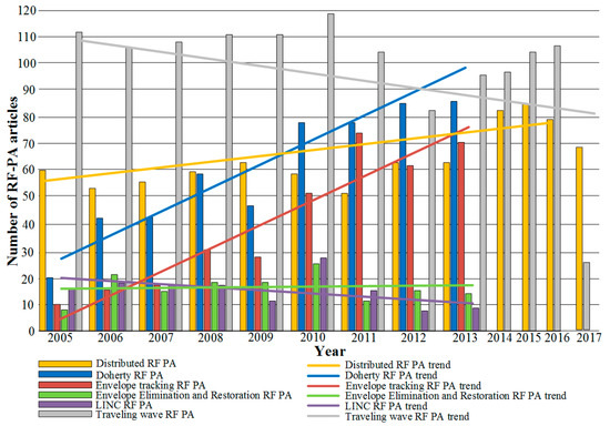 It is widely known that the RF PA is the most power-hungry component in radio transceivers and is also one of the most critical building blocks in radio front-end applications. Hence, research in this area will help drive overall 5G network costs down while achieving improved energy efficiency. A research study has been conducted in [9], which focused on investigating the development trend of RF PAs and describing the globalization, cooperation across affiliations, research cycle and architecture trends. Figure 2 presents an updated graph published in [9] adding traveling wave (TWA) and distributed PA to the overall number of published PA papers and the trend line picture.