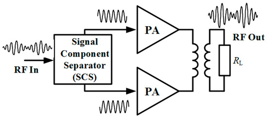 The outphasing modulation technique was invented by Henri Chierix in 1935 in order to improve both efficiency and linearity of AM-broadcast transmitters. Substantially later, its application was extended up to microwave frequencies under the name LINC (linear amplification using nonlinear components). An outphasing transmitter, presented in Figure 4, operates as a linear PA system for amplitude-modulated signals having a linear transfer function over a wide range of the input signal levels by combining the outputs of two nonlinear PAs that are driven with signals of constant amplitude but different time-varying phases corresponding to the envelope of the input signal [31].