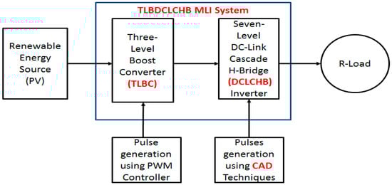 In this paper, the structure of single-phase three-level boost DC-link cascade H-bridge multilevel inverter (TLBDCLCHB MLI) system is proposed to generate a seven-level stepped output voltage waveform for PV applications. The proposed system is obtained by integrating a three-level boost converter (TLBC) with a seven-level DC-link cascade H-bridge (DCLCHB) [7,8]. Also, the objective of the proposed work is to investigate the performance of a single-phase seven-level DCLCHB inverter [9,10] using conducting angle determination (CAD) techniques [11] in terms of the total harmonic distortion (THD) and the quality of the stepped output voltage waveform. Here, equal-phase CAD (EPCAD) based on equal-area distribution and step pulse wave CAD (SPWCAD) based on volt-second area equal to step pulse wave techniques are proposed to evaluate the performance of the DCLCHB inverter [12]. The proposed TLBDCLCHB MLI system is modeled, simulated and validated through experimental setup using field-programmable gate array (FPGA)-based pulse generation.