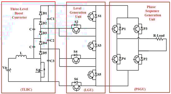 The block diagram of the proposed TLBDCLCHB MLI system is shown in Figure 1. The proposed TLBDCLCHB MLI system consists of single DC voltage source, TLBC, and DCLCHB inverter to generate a seven-level stepped output waveform. The DCLCHB inverter is composed of level generation unit (LGU) and phase sequence generation unit (PSGU). LGU is used to generate the required number of levels and PSGU is used to generate positive and negative sequence voltage levels [13]. The equivalent structure of TLBDCLCHB MLI system is shown in Figure 2.