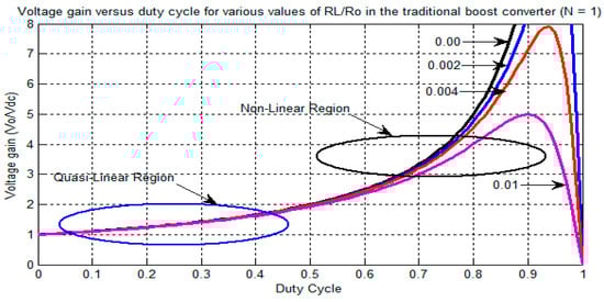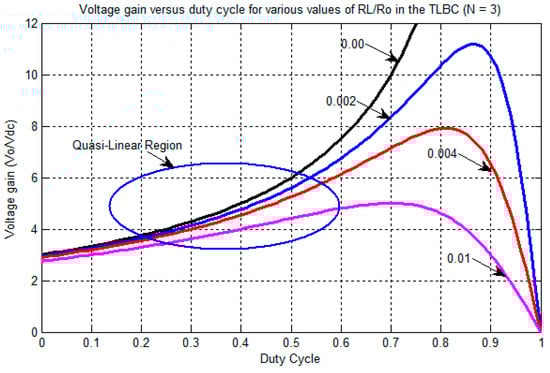 Similarly, from Figure 4, i.e., when N = 3, it can be observed that the quasi-linear region is extended with a high voltage gain for the TLBC. Therefore, the TLBC achieves a high voltage gain compared to the traditional boost converter, and, also a better operating point of the duty cycle for the TLBC, which is from 0.4 to 0.6.