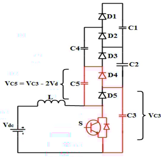 In actual operation of TLBC, the voltage drop across the switch and diodes must be considered since it avoids full charge across the capacitors [17,18]. Therefore, it reduces the conversion efficiency of the TLBC topology. In general, the voltage drop in the power switches and diodes can be around 2 V, and it can be neglected in medium- and high-voltage applications but must be considered in low-voltage applications. Here, the voltage drop across the switch and diodes is assumed to be equal to ‘Vd’.