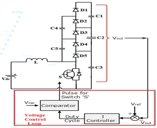 From Figure 5 and Equation (10), it can be observed that the output voltage gain depends on the ratio of load resistance (RO) and source resistance (RL), i.e., if there is any variation between the load and source resistances, the output voltage of TLBC is not kept constant, and, from Equation (13), there will be a variation in the duty cycle to get the required amount of output voltage by considering the voltage drop across the switch and diodes. Therefore, the proposed TLBC circuit is modeled in closed-loop mode using an integral controller to maintain the constant output voltage.