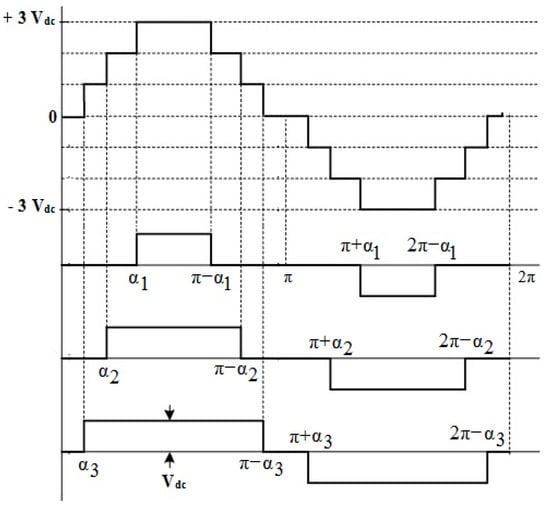 The generation of a step pulse wave in the DCLCHB inverter to meet the equivalent areas as A11, A21, and A31. Here, main conducting angles () are defined as the switching timing angles of step pulse waves in the DCLCHB inverter. Figure 10 represents the main conducting angles and the stepped output phase voltage of the seven-level DCLCHB inverter during the positive half cycle.