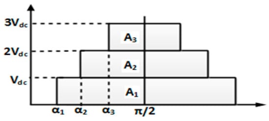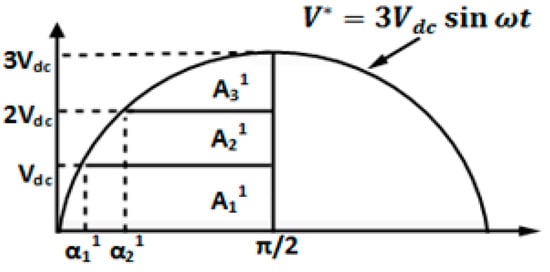 Figure 9 demonstrates the dummy conducting angles (αi1) in the case of Mi = π/4. The areas of A11, A21, and A31 are encompassed by the sine reference voltage wave and the stepped output-phase voltage levels in the positive half-cycle of the seven-level DCLCHB inverter.